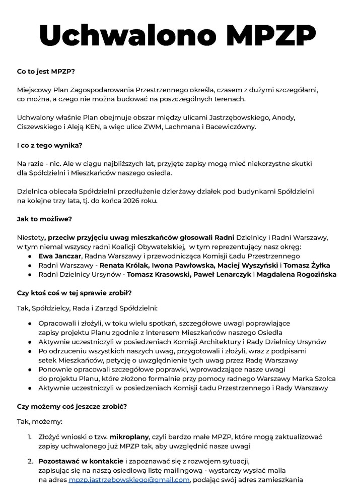 Jeśli macie Państwo pytania lub wątpliwości w temacie, lub chcielibyście pomóc zawiadomić pozostałe Sąsiadki i Sąsiadów, skontaktujcie się z Jeremim Czarneckim: +48 608 335 400.