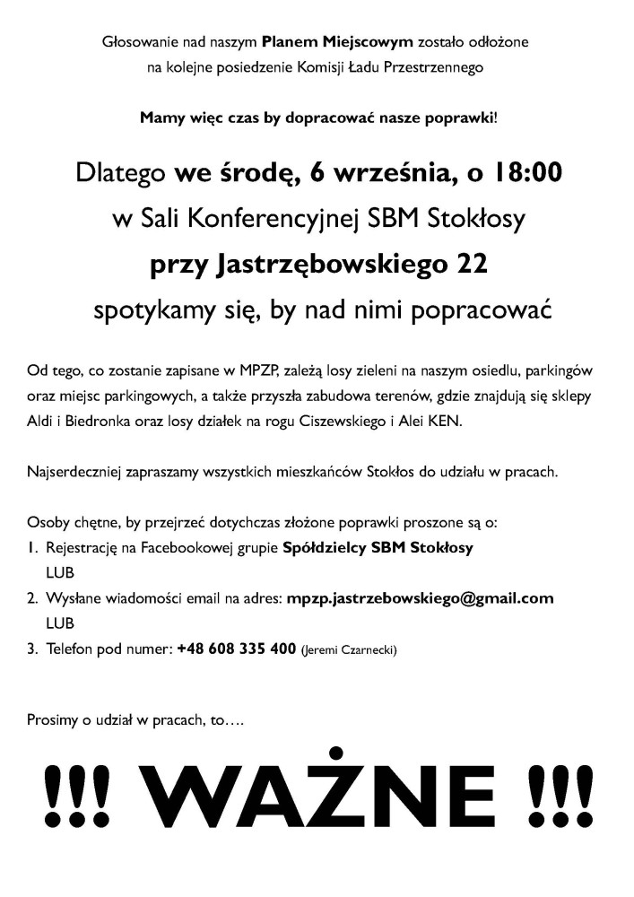 Zarząd SBM STOKŁOSY informuje o uruchomieniu petycji do Członków Komisji Ładu Przestrzennego m. st. Warszawy w sprawie uwag do projektu miejscowego planu zagospodarowania przestrzennego po północnej stronie ulicy Ciszewskiego. Petycja opublikowana jest pod adresem: www.planstoklosy.pl.