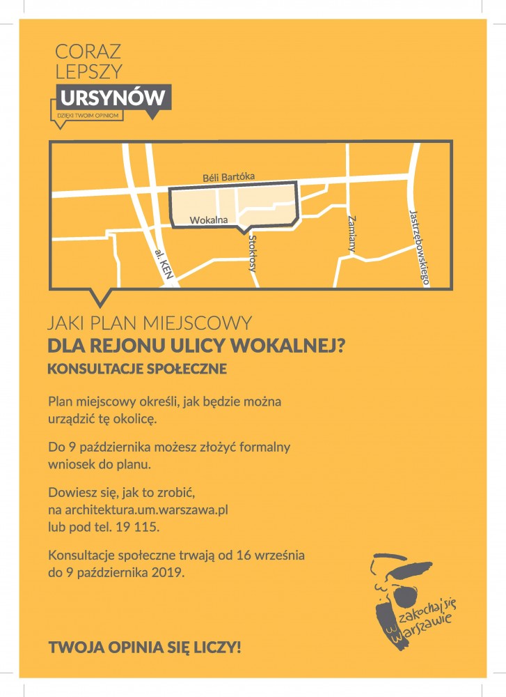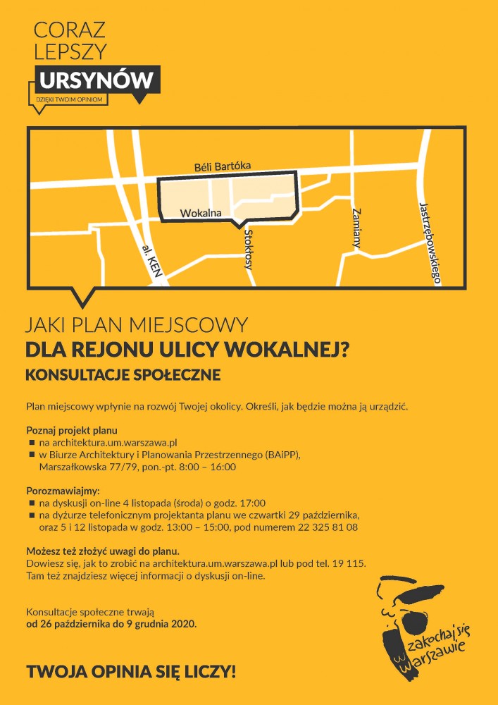 Z uwagi na obwieszczenie z dnia 9 października 2020 r. o wyłożeniu do publicznego wglądu projektu miejscowego planu zagospodarowania przestrzennego w rejonie ulicy Wokalnej, wobec podjęcia przez Radę m.st. Warszawa Uchwały nr LXXIV/2094/2018 z dnia 27 września 2018 r., pragniemy przypomnieć o możliwości zapoznania się z wyłożonym materiałem i złożenia uwag.