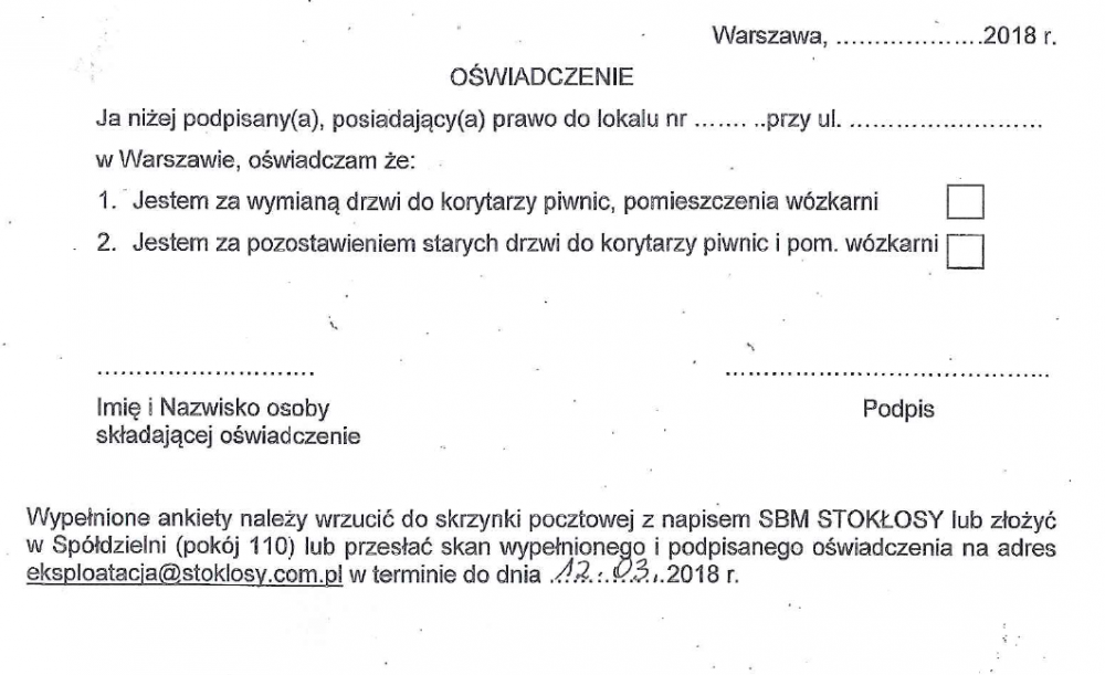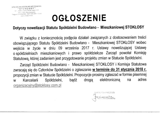 Komisja Statutowa uprzejmie powiadamia, że termin składania propozycji zmian do Statutu SBM STOKŁOSY przedłużono do 31 marca 2018 r.