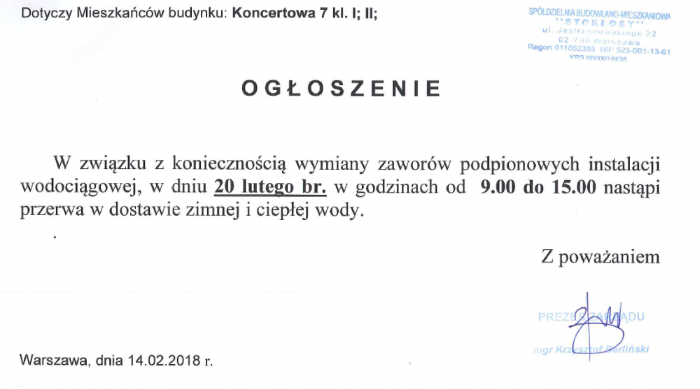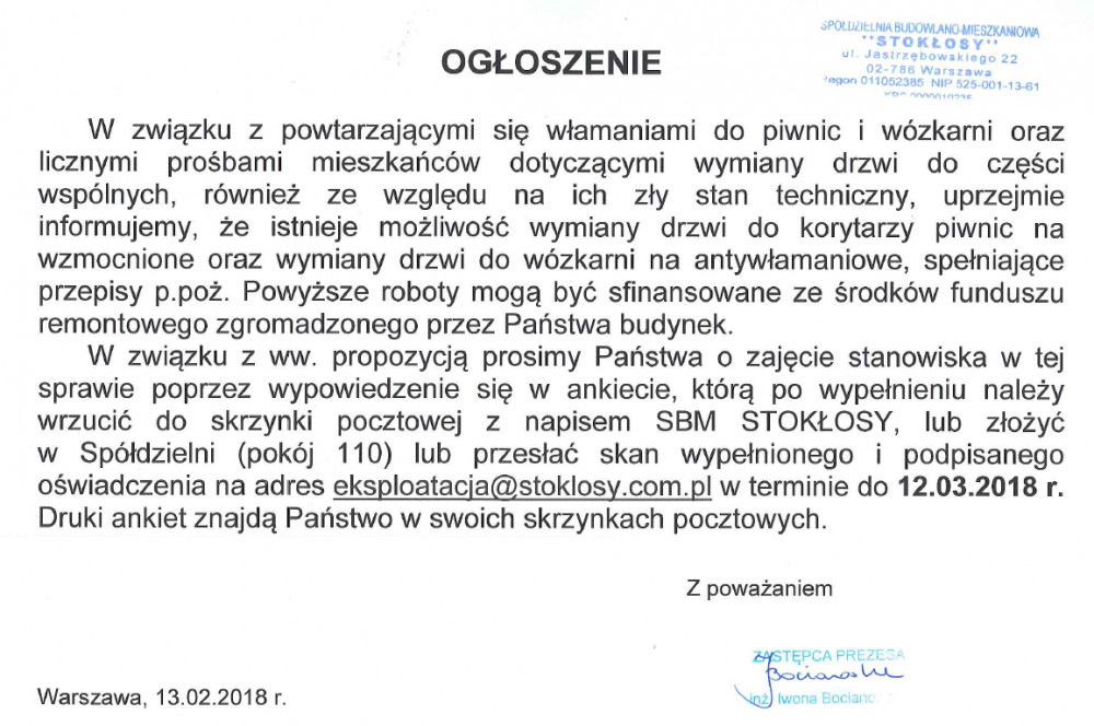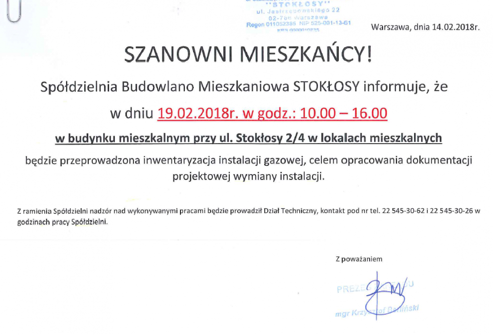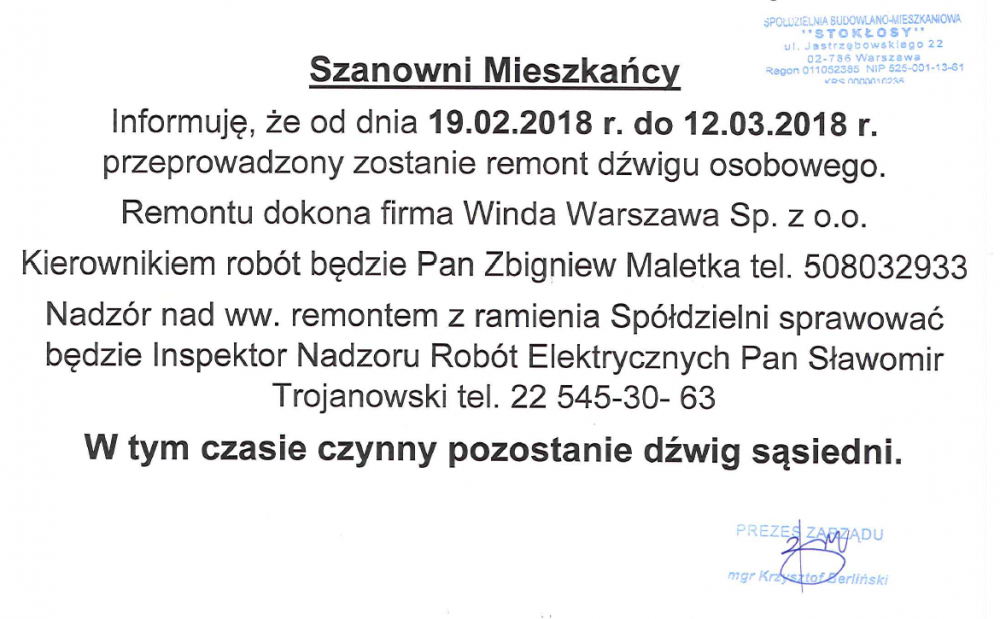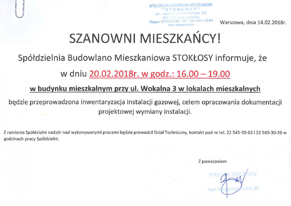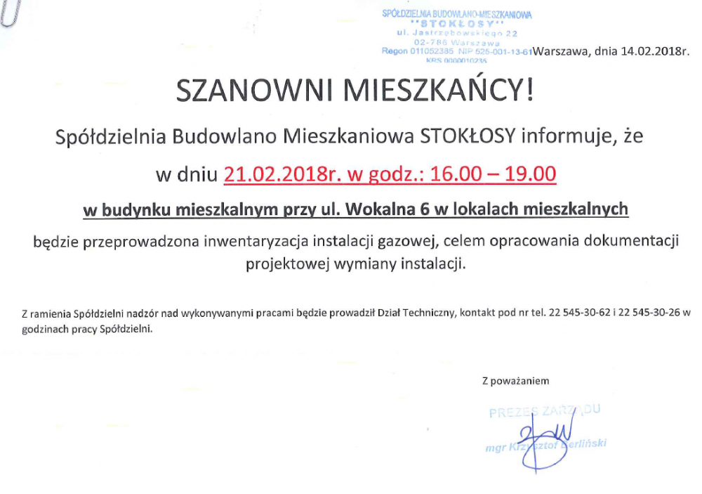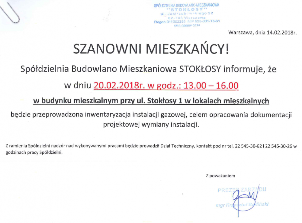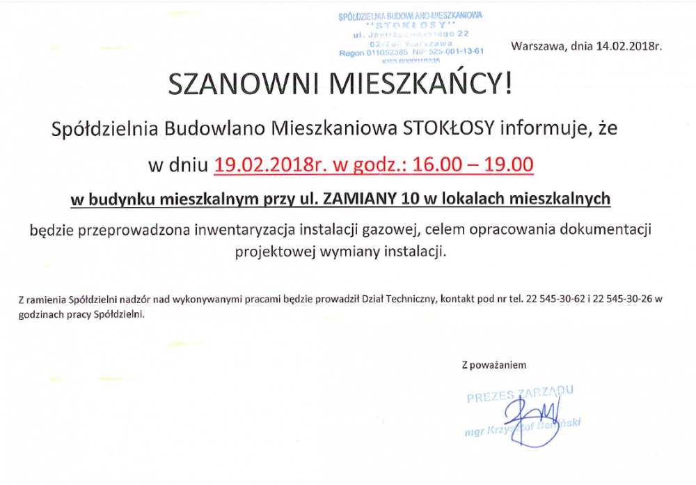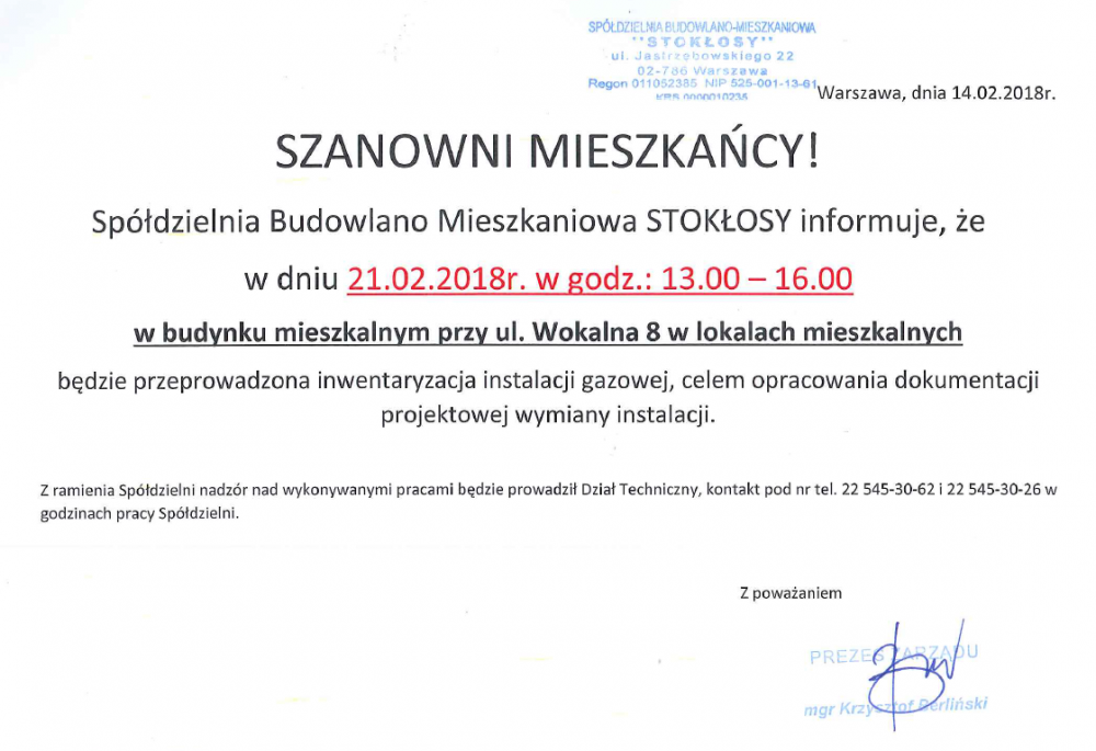 Zarząd SBM STOKŁOSY przypomina, że od maja ubiegłego roku stacjonarna praca pracowników biura Spółdzielni odbywa się w pełnym zakresie.