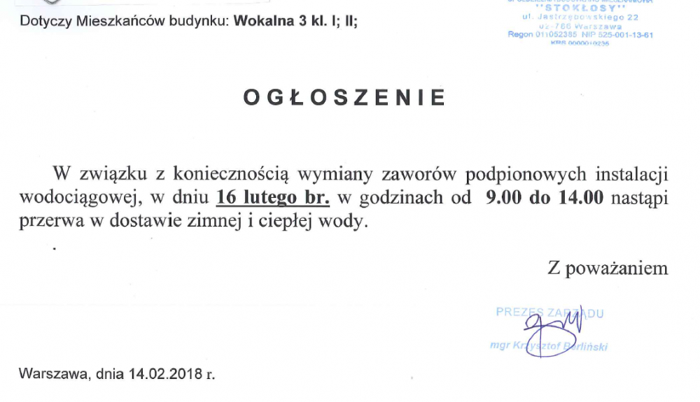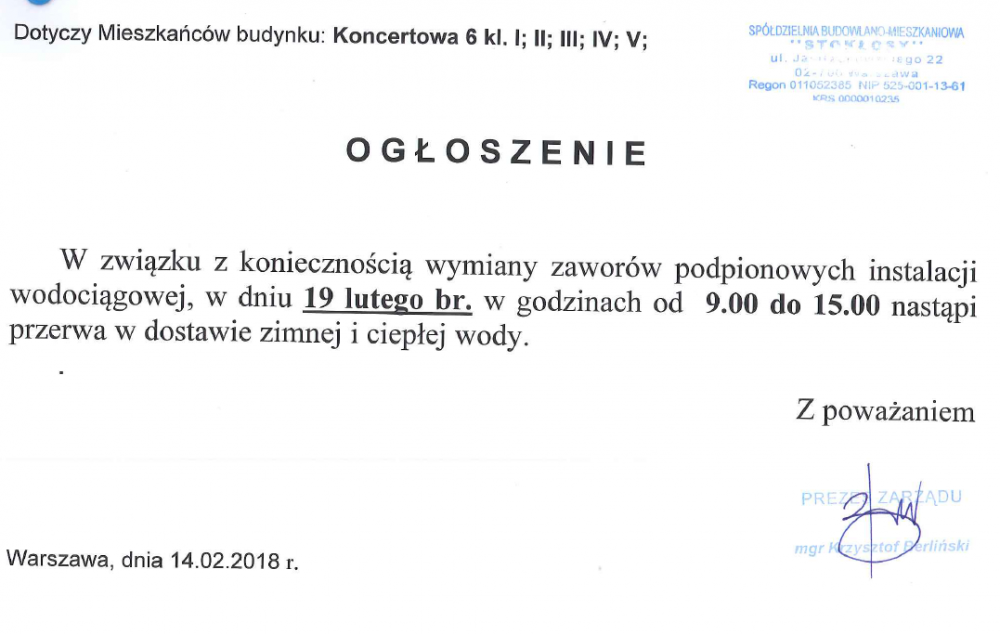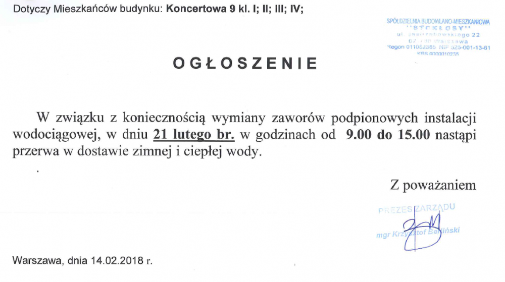 Informujemy jednocześnie, że od dnia 1.04.2022 r. Prezes Zarządu przyjmuje interesantów w każdy poniedziałek w godzinach od 15:00 do 17:00 oraz dodatkowo w każdą środę w godzinach od 13:30 do 15:30.