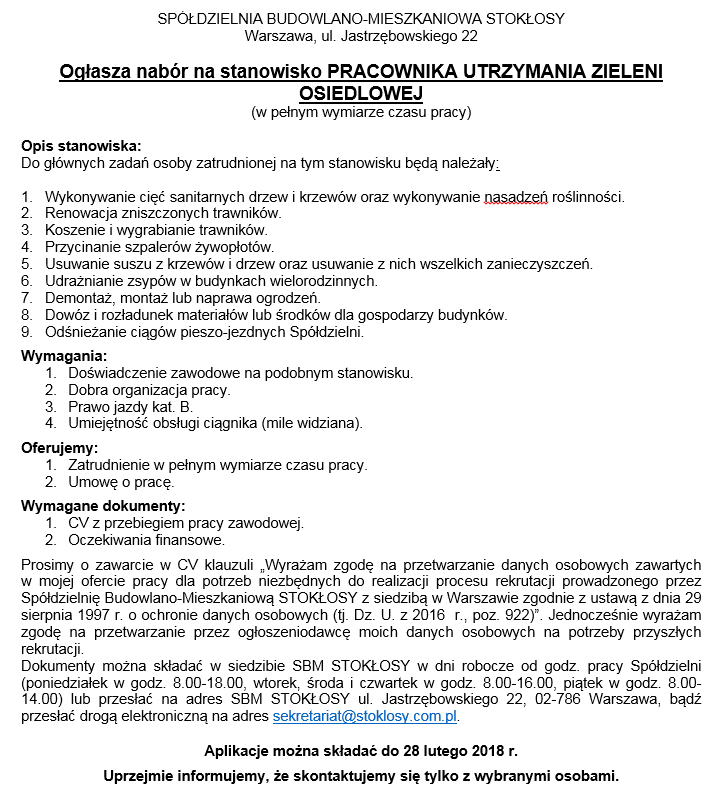 Informujemy, że administratorem danych jest Spółdzielnia Budowlano-Mieszkaniowa STOKŁOSY z siedzibą w Warszawie przy ul. Jastrzębowskiego 22. Dane zbierane są dla potrzeb rekrutacji. Ma Pani/Pan prawo dostępu do treści swoich danych oraz ich poprawiania. Podanie danych w zakresie określonym przepisami ustawy z dnia 26 czerwca 1974 r. Kodeks pracy oraz aktów wykonawczych jest obowiązkowe. Podanie dodatkowych danych osobowych jest dobrowolne.