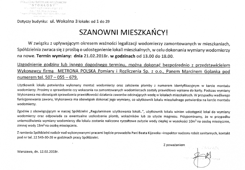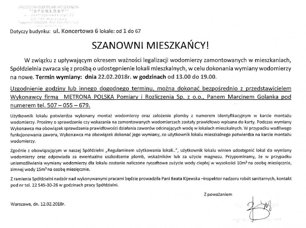 Wymiana wodomierzy 22.02.2018 r. - dot. budynku przy ul. Koncertowa 6