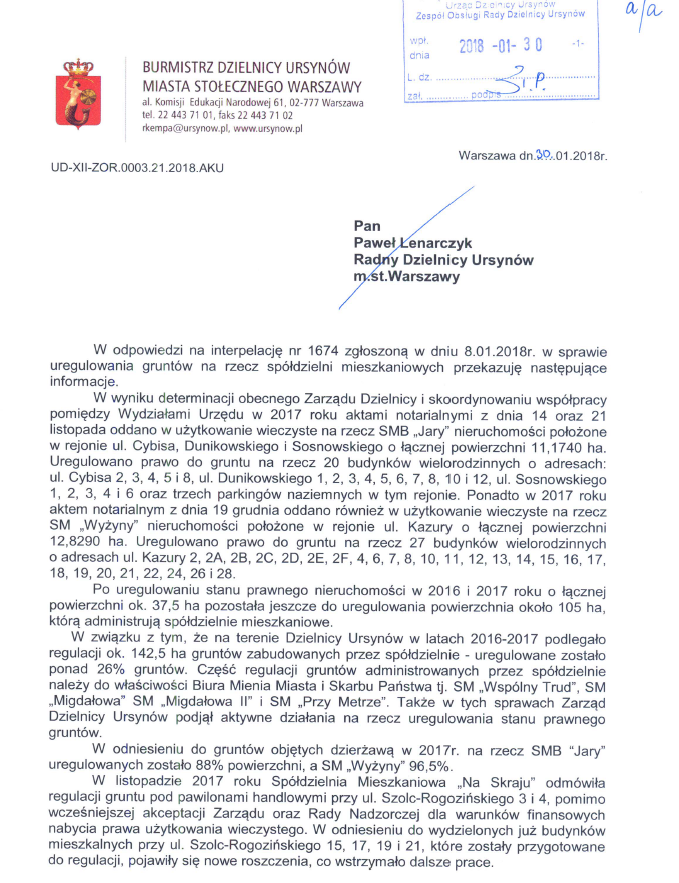 Publikujemy poniżej odpowiedź Burmistrza Dzielnicy Ursynów Pana Roberta Kempy na interpelację Pana Radnego Pawła Lenarczyka nr 1674 z dnia 08.01.2018r. w sprawie uregulowania własności gruntów w dzielnicy Ursynów (kontynuacja interpelacji nr 15, 1117).