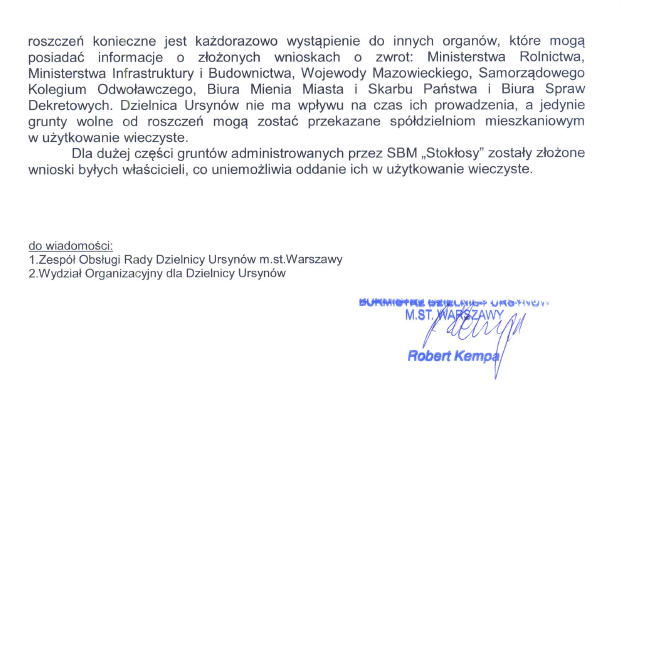 Jednocześnie Zarząd SBM STOKŁOSY pragnie serdecznie podziękować Panu Radnemu za zaangażowanie i pomoc w tej jakże istotnej dla wszystkich mieszkańców naszej Spółdzielni sprawie, jaką jest regulacja stanu prawnego gruntów, na których zrealizowane zostało Osiedle STOKŁOSY.