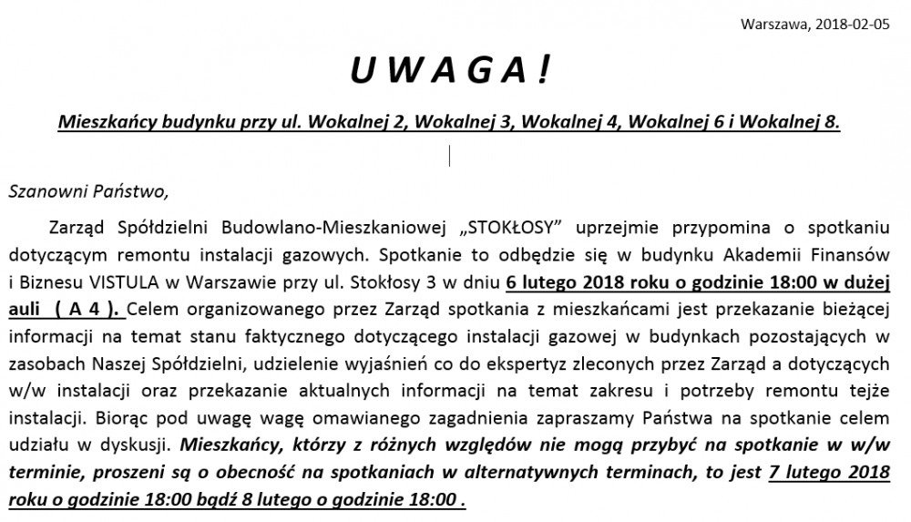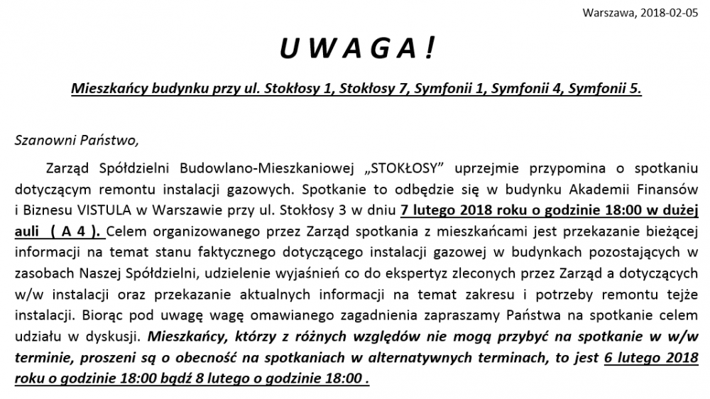 Spółdzielnia Budowlano - Mieszkaniowa STOKŁOSY w zakładce "Czytaj dalej" publikuje zgromadzoną korespondencje i dokumentację w sprawie nadmiernego hałasu na osiedlu STOKŁOSY, w szczególności w rejonie ul. Koncertowej. Zapraszamy Państwa do zapoznania się z opublikowanymi materiałami.