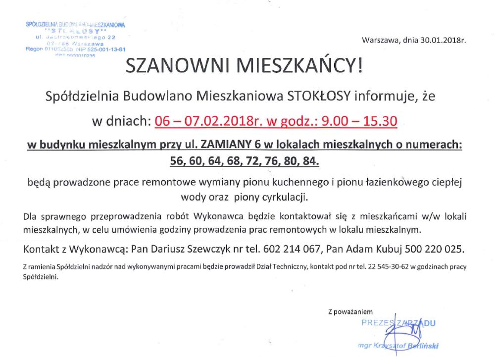 Zarząd SBM STOKŁOSY przypomina, że od maja ubiegłego roku stacjonarna praca pracowników biura Spółdzielni odbywa się w pełnym zakresie.