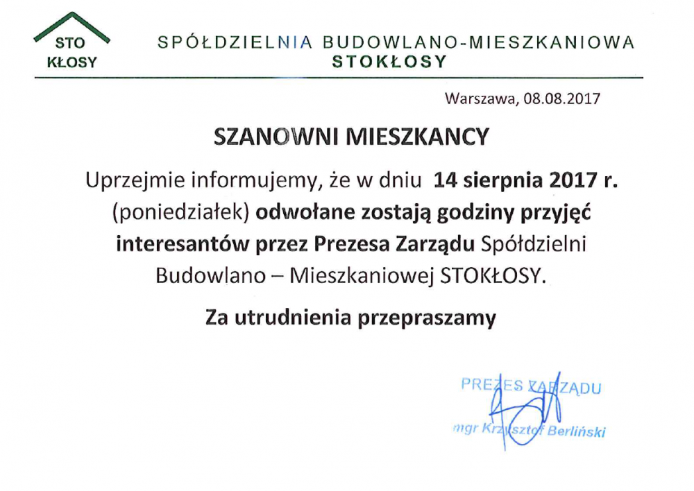 Informujemy jednocześnie, że od dnia 1.04.2022 r. Prezes Zarządu przyjmuje interesantów w każdy poniedziałek w godzinach od 15:00 do 17:00 oraz dodatkowo w każdą środę w godzinach od 13:30 do 15:30.