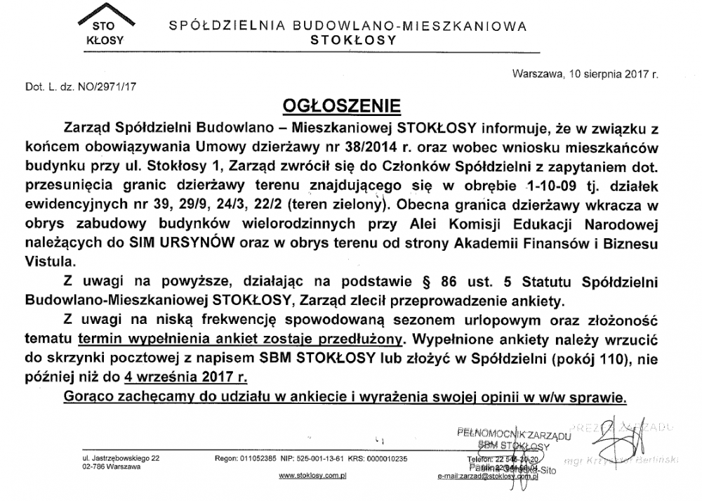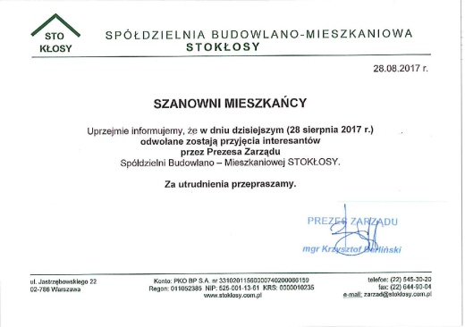 OGŁOSZENIE DOT. UL. STOKŁOSY 1