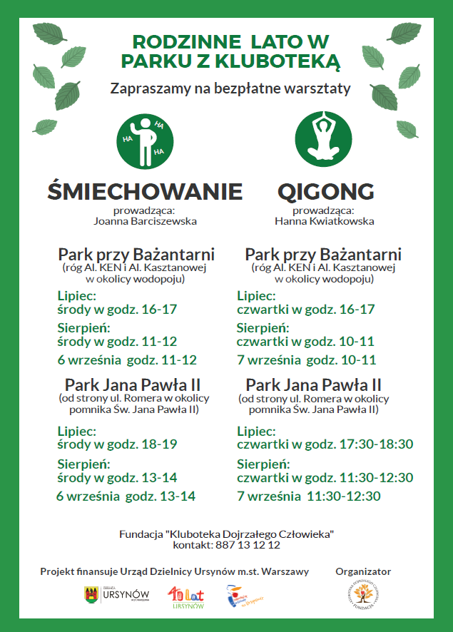 Urząd Dzielnicy Ursynów m.st. Warszawy i „Kluboteka Dojrzałego Człowieka” serdecznie zapraszają Państwa na otwarte warsztaty „śmiechowania” oraz letni, harmonijny Qigong.