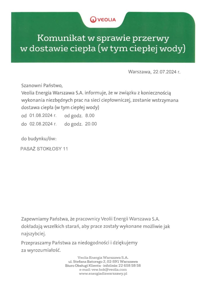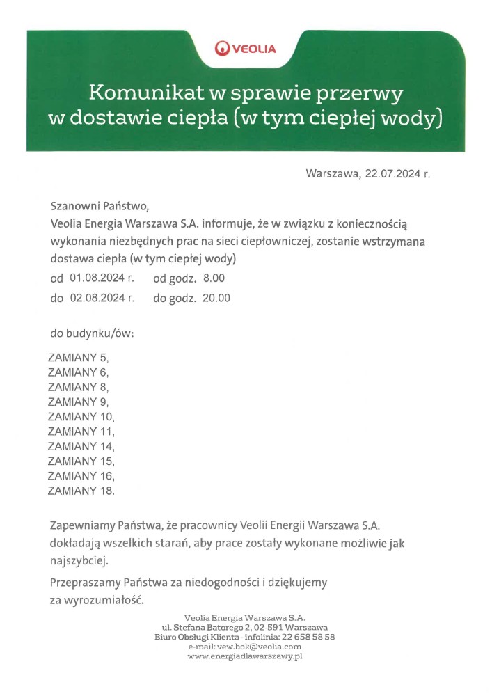 2. Komunikat w sprawie przerwy w dostawie ciepła (w tym ciepłej wody)