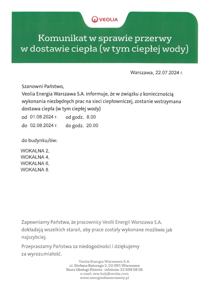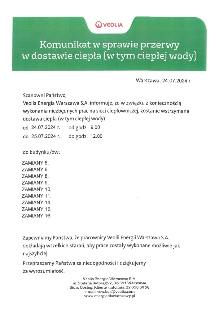1.Komunikat w sprawie przerwy w dostawie ciepła (w tym ciepłej wody)