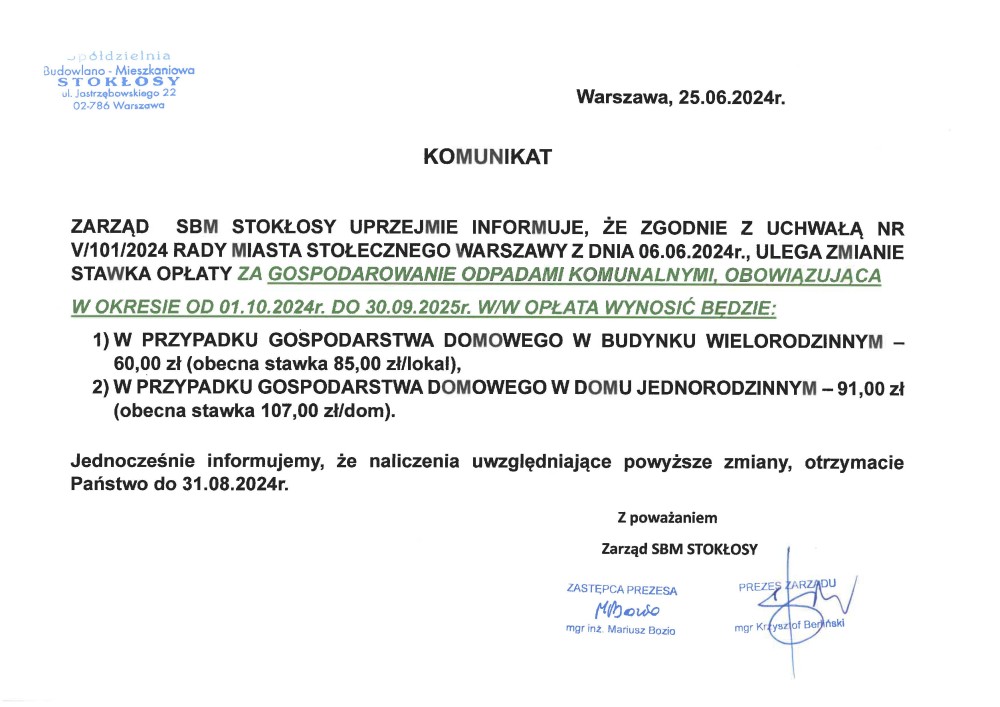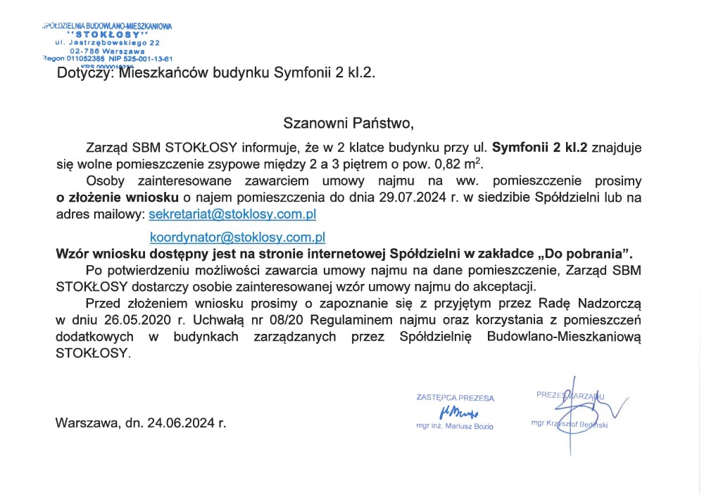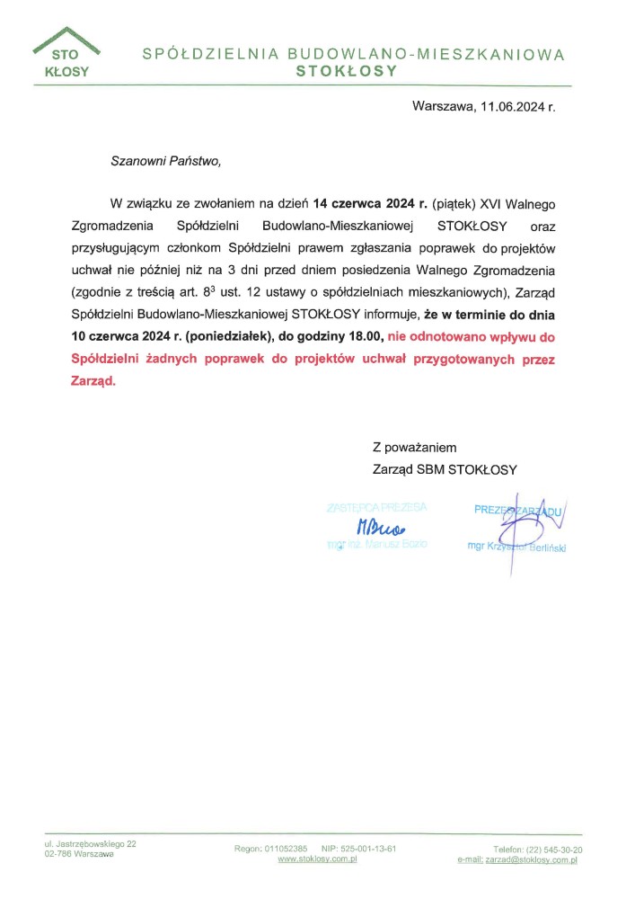 Rada Nadzorcza SBM Stokłosy uprzejmie informuje, że w związku z trwającym okresem urlopowym odwołuje zapowiedziane wcześniej posiedzenie Rady Nadzorczej na dzień 12 sierpnia 2024 r. Zgodnie z terminarzem pracy rady kolejne posiedzenie jest zaplanowane w poniedziałek 26 sierpnia 2024 r. o godz. 17:15 w sali konferencyjnej biura Spółdzielni.