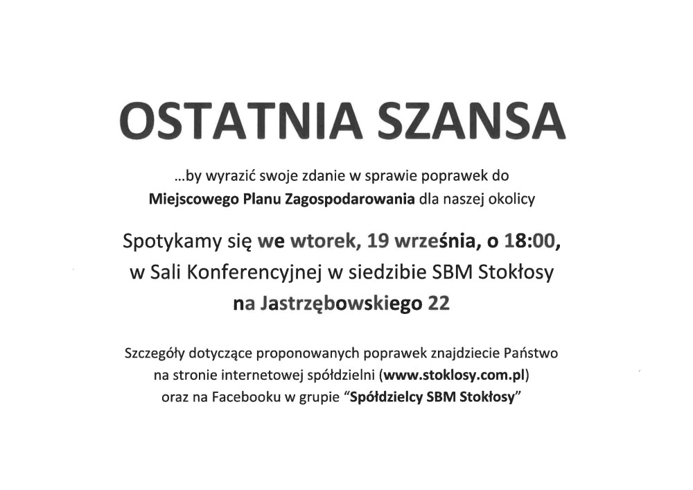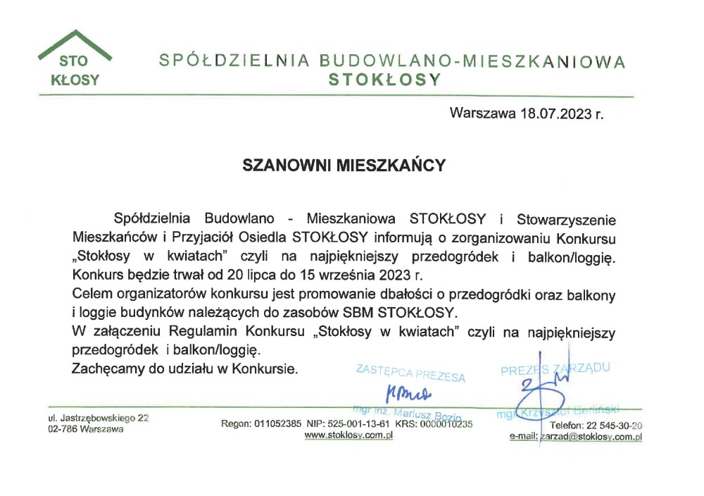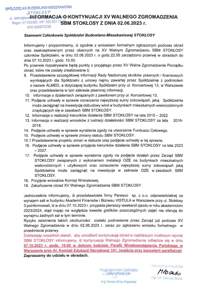 Zarząd Spółdzielni Budowlano-Mieszkaniowej STOKŁOSY informuje, że