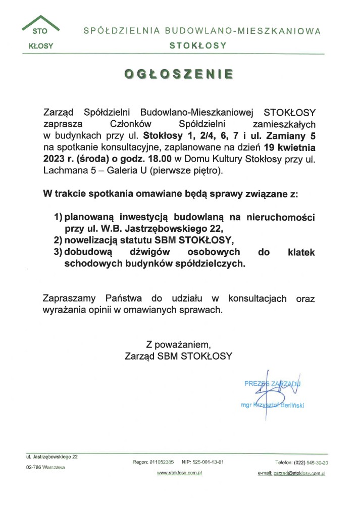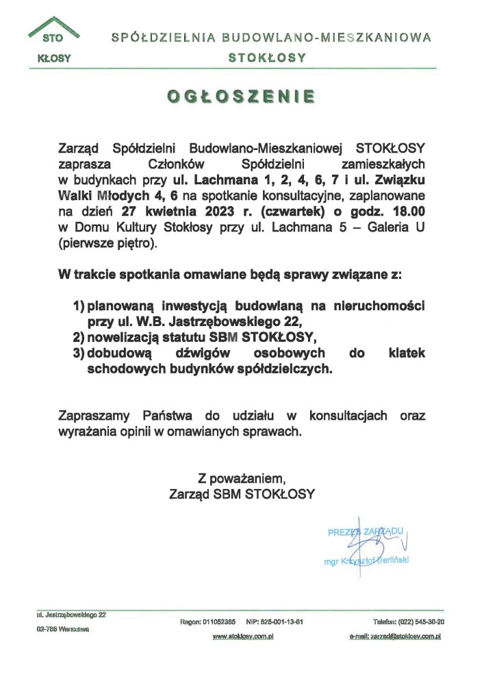 Zarząd SBM STOKŁOSY przypomina, że od maja ubiegłego roku stacjonarna praca pracowników biura Spółdzielni odbywa się w pełnym zakresie.