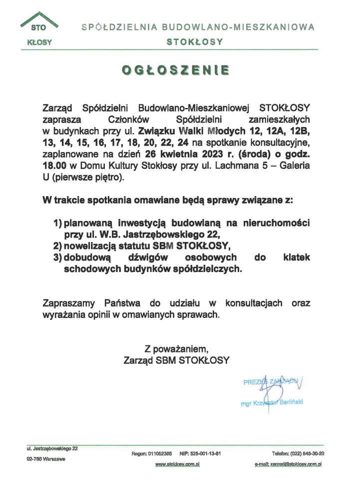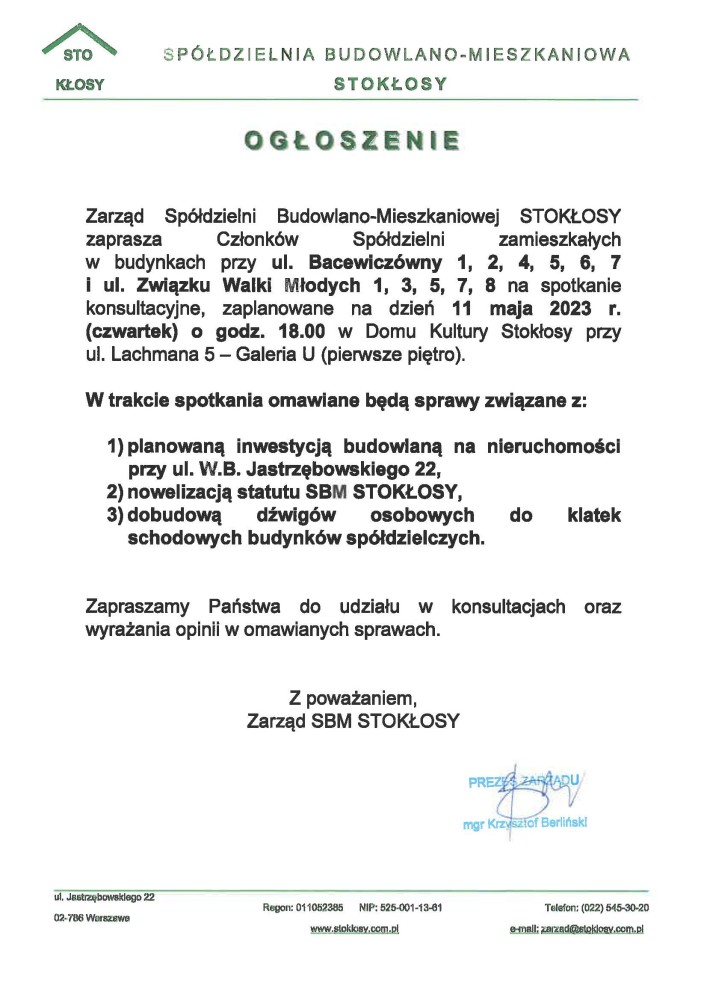 Wersje papierowe projektu Statutu można otrzymać w biurze Spółdzielni u Pani Anny Baj, pokój 117, tel. 22 545 30 30, e-mail a.baj@stoklosy.com.pl.