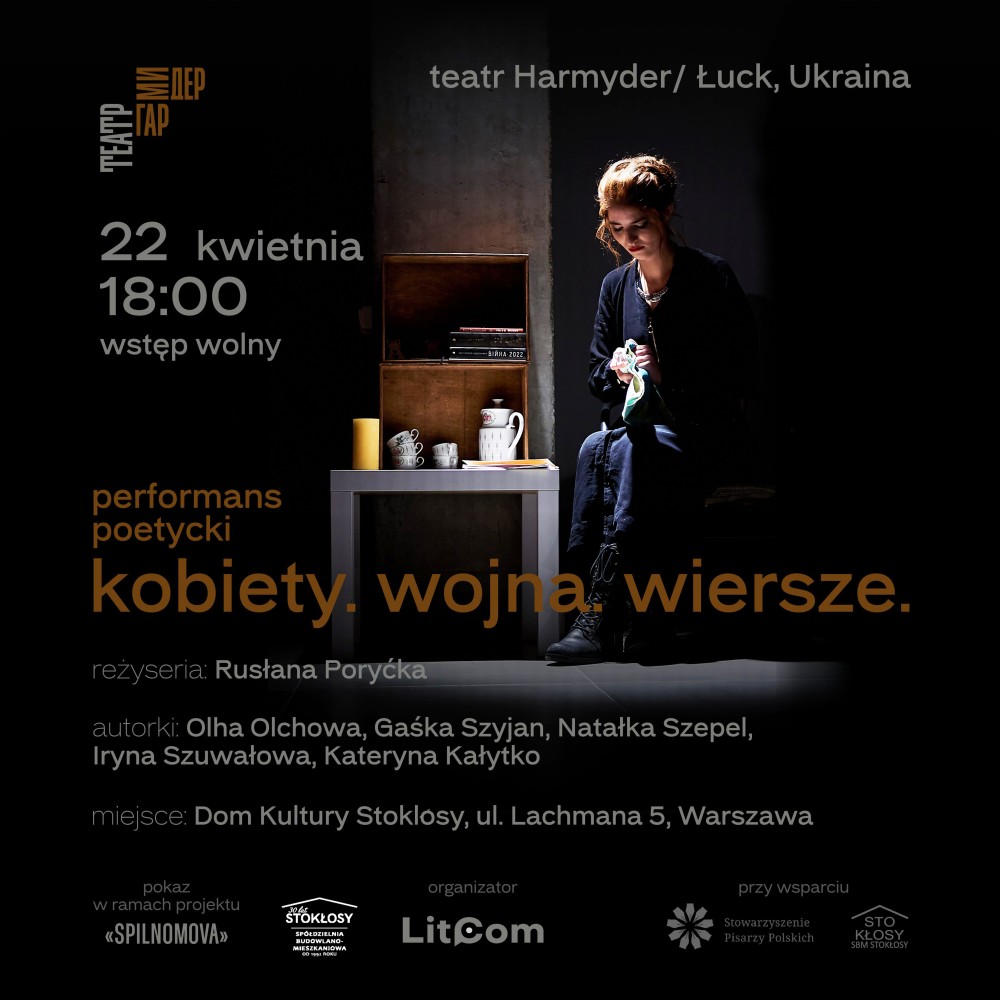 Spektakl „kobiety.wojna.wiersze” na podstawie twórczości znanych ukraińskich poetek: Olhi Olchowej, Kateryny Kalytko, Gaski Szyjan, Natalki Szepel, to przejmująca próba opowiedzenia językiem teatru i poezji o tragedii współczesnej wojny rosyjsko-ukraińskiej.