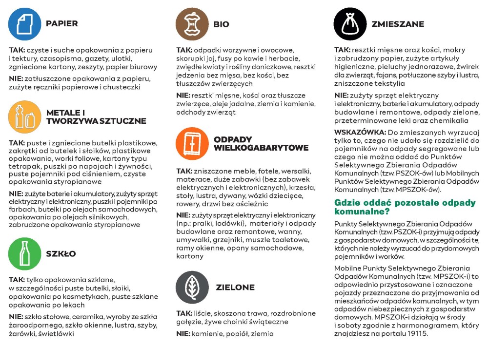 papier, metale i tworzywa sztuczne, szkło, bio, odpady zmieszane, "zielone", odpady wielkogabarytowe.