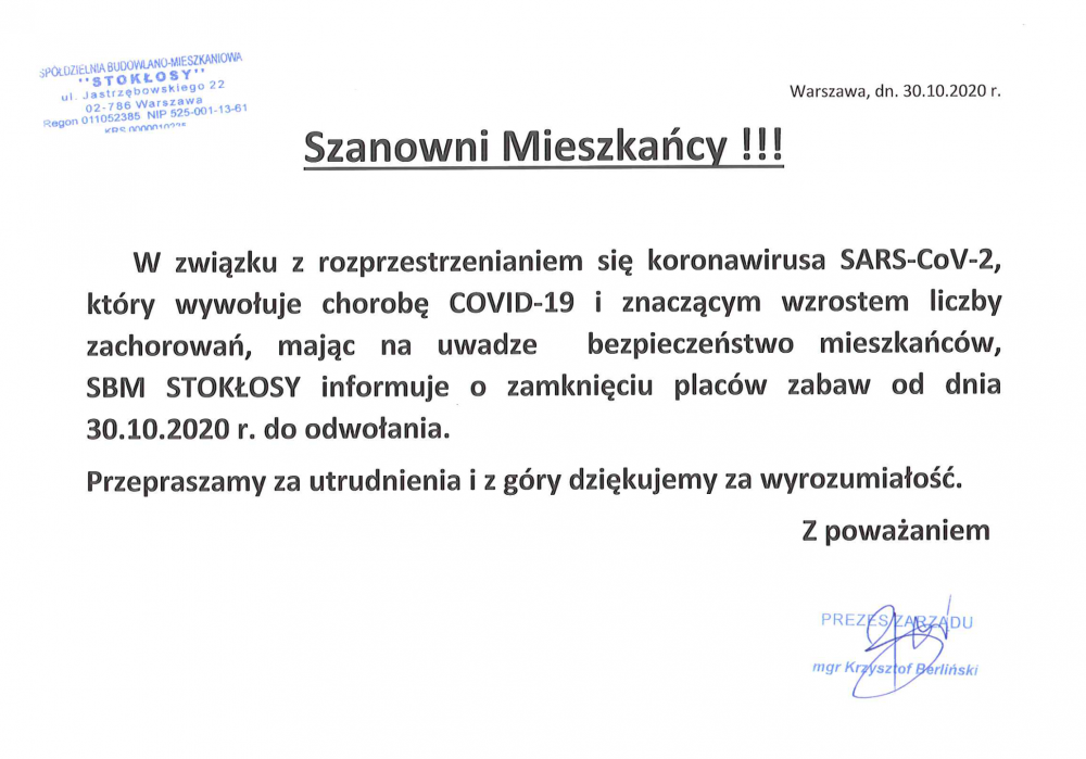 W związku z potwierdzonym przypadkiem zachorowania na COVID-19 wśród pracowników SBM STOKŁOSY oraz powstałym zgrożeniem epidemicznym, w dniach od 4.11.2020 r. do 6.11.2020 r. biuro Spółdzielni przy ul. Jastrzębowskiego 22 będzie zamknięte ze względu na konieczność przeprowadzenia ozonowania.