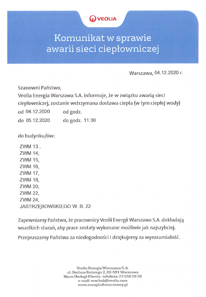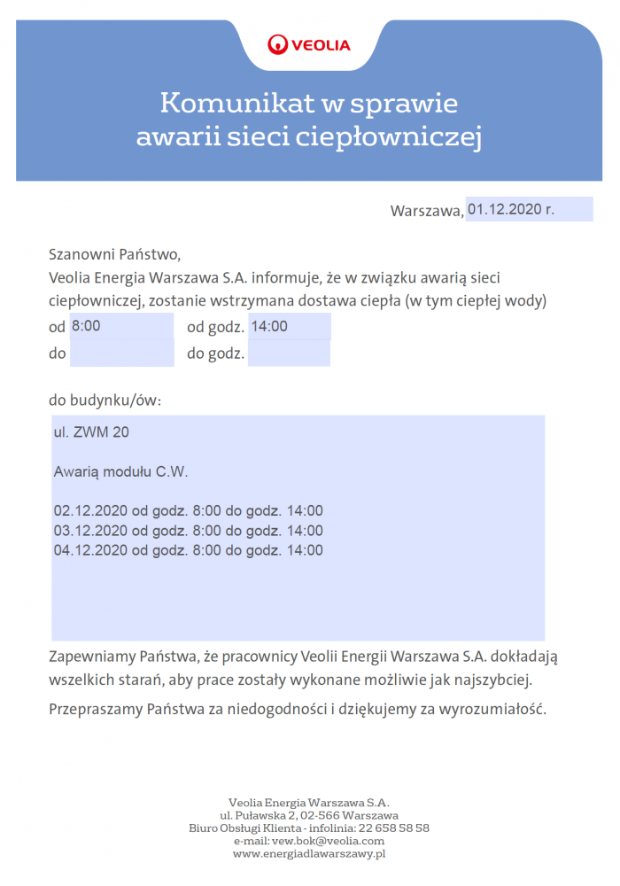 Komunikat w sprawie awarii sieci ciepłowniczej - ul. ZWM 20