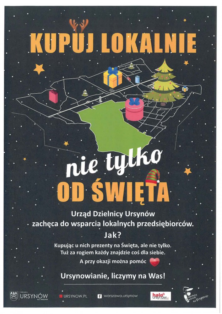 Urząd Dzielnicy Ursynów, z inicjatywy radnej Olgi Górnej, organizuje akcję „kupuj lokalnie, nie tylko od świąt”, czyli akcję wsparcia lokalnych przedsiębiorców. Wiele mniejszych ursynowskich firm, czy sklepików jest zagrożonych i walczy w czasach pandemii COVID-19 walczy o przetrwanie. Wiele osób zastanawia sie nad prezentami,szuka czegoś wyjątkowego, zatem to idealny czas, aby zwrócić uwagę na małe, lokalne firmy i sklepy. Tuż za rogiem każdy znajdzie coś dla siebie.