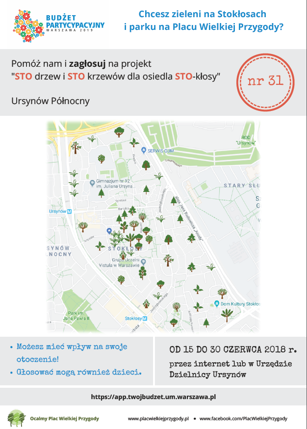 Do 30 czerwca br. trwa głosowanie dotyczące kształtu budżetu partycypacyjnego Warszawy. Zachęcamy naszych mieszkanców do głosowania na projekt nr 246 - "Sto drzew i sto krzewów dla osiedla Stokłosy".