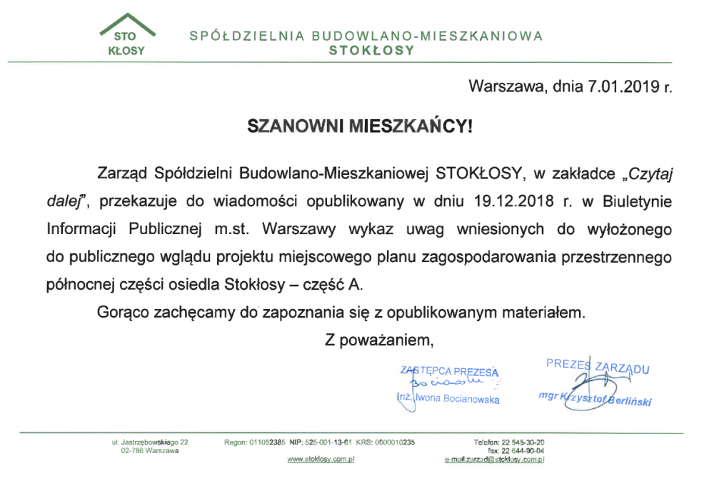 Zarząd Spółdzielni Budowlano-Mieszkaniowej STOKŁOSY pragnie poinformować, że dnia 4 lipca 2019 r. odbyła się XV Sesja Rady m.st. W-wy, na której Uchwałą nr XV/346/2019 przyjęto miejscowy plan zagospodarowania przestrzennego dla północnej części osiedla Stokłosy - część A.