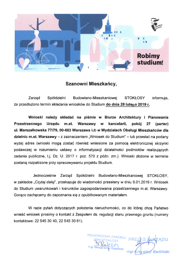 Z uwagi na ogłoszenie Prezydenta m.st. Warszawy z dnia 4 września 2018 r. o przystąpieniu do Studium uwarunkowań i kierunków zagospodarowania przestrzennego m.st. Warszawy, wobec podjęcia przez Radę m.st. Warszawa uchwały nr LXVII/1854/2018 z dnia 24 maja 2018 r., pragniemy przypomnieć o zbliżającym się terminie na składanie wniosków.