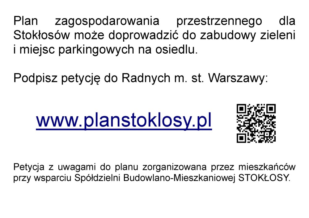 Zarząd SBM STOKŁOSY informuje o uruchomieniu petycji do Członków Komisji Ładu Przestrzennego m. st. Warszawy w sprawie uwag do projektu miejscowego planu zagospodarowania przestrzennego po północnej stronie ulicy Ciszewskiego. Petycja opublikowana jest pod adresem: www.planstoklosy.pl.