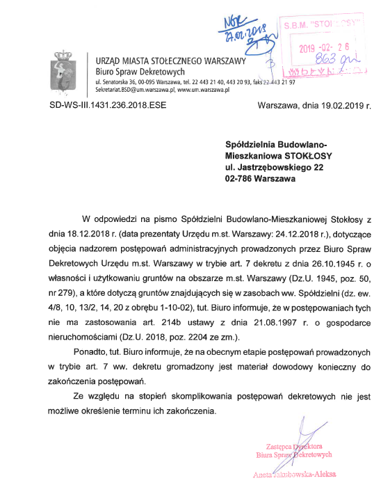 Zarząd SBM STOKŁOSY pragnie poinformować o treści pisma z dnia 19.02.2019 r. uzyskanego z Biura Spraw Dekretowych Urzędu m.st. Warszawy (dot. nieruchomości przy ul. Koncertowej 9, 10, 13 oraz części terenu domków jednorodzinnych). Z przykrością należy stwierdzić, iż na obecną chwilę termin zakończenia postępowań roszczeniowych nie jest znany.