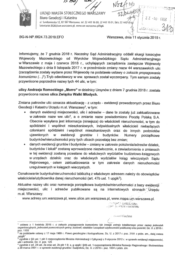 Inf. Urzędu Miasta st. Warszawy o zmianie nazwy ulicy i przywróceniu nazwy ulicy Związku Walki Młodych