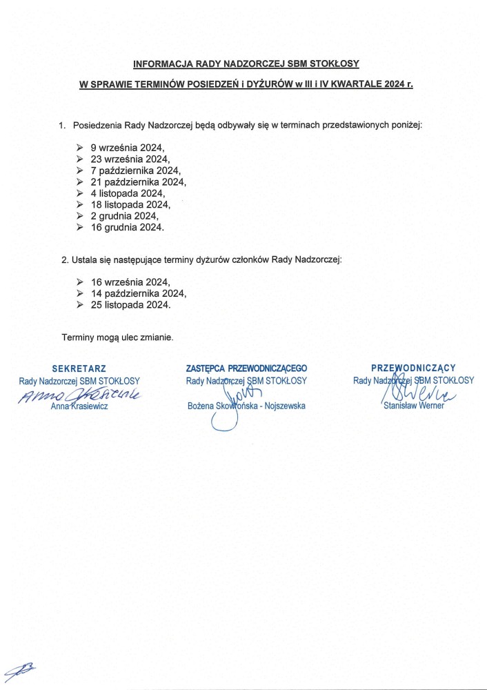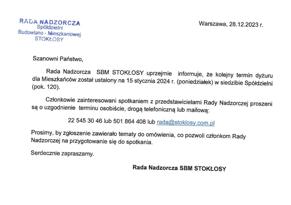 Rada Nadzorcza SBM STOKŁOSY uprzejmie informuje, że kolejny termin dyżuru dla Mieszkańców został ustalony na 19 lutego 2024 r. (poniedziałek) w siedzibie Spółdzielni (pok. 120).