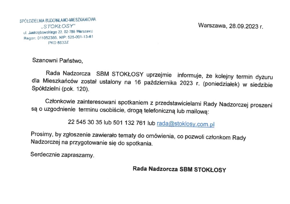 Rada Nadzorcza SBM STOKŁOSY uprzejmie informuje, że kolejny termin dyżuru dla Mieszkańców został ustalony na 06 listopada 2023 r. (poniedziałek) w siedzibie Spółdzielni (pok. 120).
