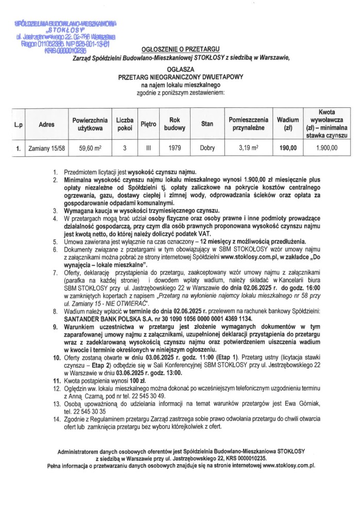 OGŁOSZENIE O WYNAJMIE LOKALU MIESZKALNEGO