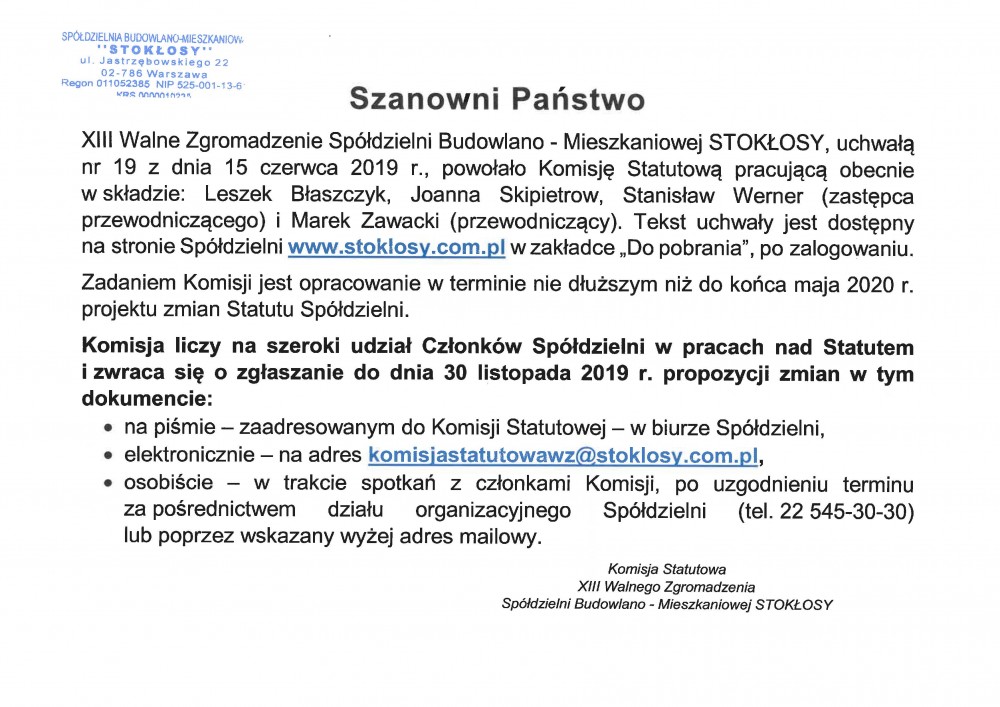 W związku z decyzją XIV Walnego Zgromadzenia o nierozpatrywaniu punktu porządku obrad dotyczącego przyjęcia zmian w Statucie SBM STOKŁOSY i regulaminów Walnego Zgromadzenia, Rady Nadzorczej oraz Zebrania Członków i Rady Nieruchomości, Komisja Statutowa ponownie zwraca się o zgłaszanie uwag i propozycji do projektów tych dokumentów, w terminie do dnia 4 września 2022 r.: