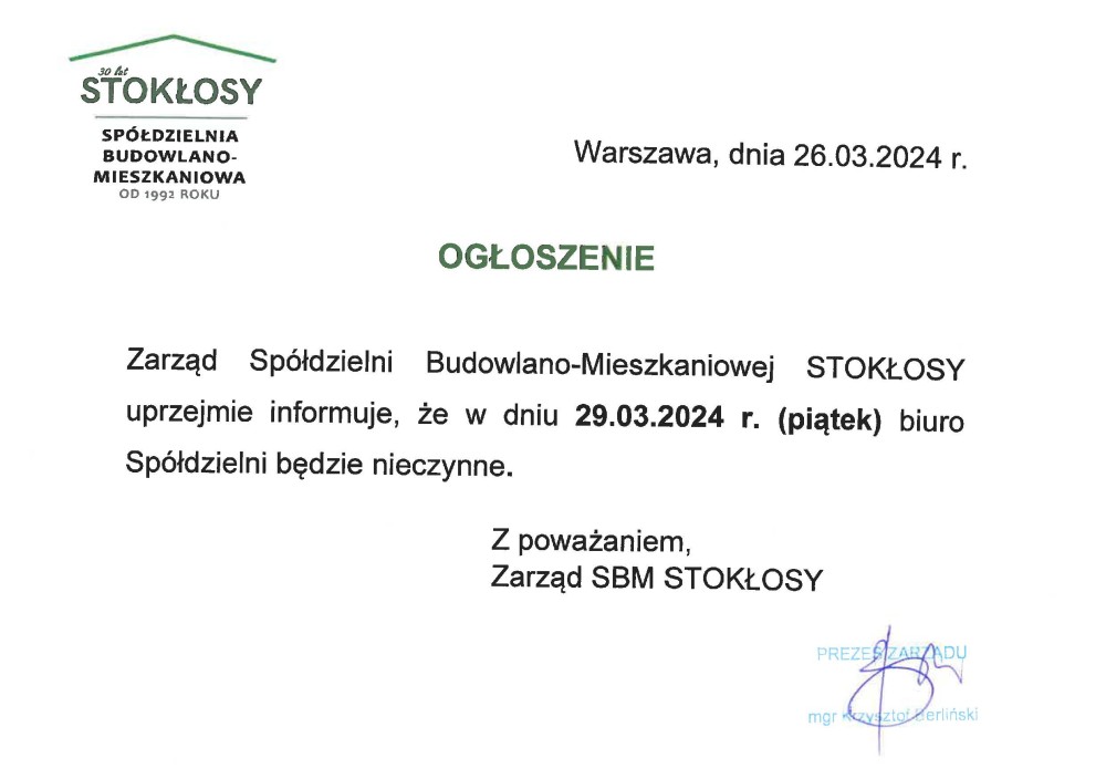 Zarząd SBM STOKŁOSY przypomina, że od maja ubiegłego roku stacjonarna praca pracowników biura Spółdzielni odbywa się w pełnym zakresie.