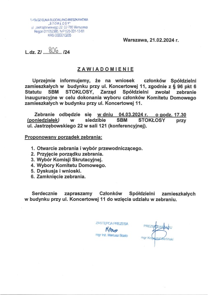 Rada Nadzorcza SBM STOKŁOSY uprzejmie informuje, że kolejny termin dyżuru dla Mieszkańców został ustalony na 15 kwietnia 2024 r. (poniedziałek) w siedzibie Spółdzielni (pok. 120).